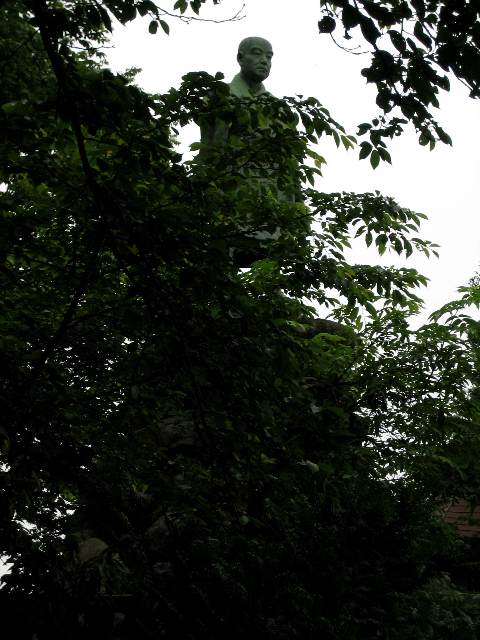 Hosenji Kanazawa; Saturday, June 10, 2006: At the top of a large hill at Utatsuyama in Kanazawa is a very large statue at the temple of Hosenji. This is a view from the foot path that leads to an overlook of a lot of the city's buildings.