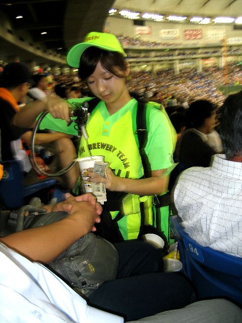 player, and beer girls running up and down the aisles with kegs on their backs. The Kirin girl